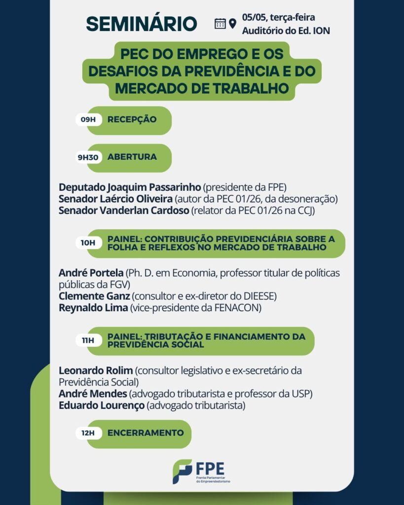 A Cebrasse convida as lideranças dos setores de serviços a participarem de importante evento no dia 5 de Maio, pela manhã em Brasília. O evento irá tratar da PEC do Emprego (PEC 01/2026), de autoria do Sen. Laércio Oliveira, que substitui a contribuição previdenciária de 20% sobre a folha de pagamentos por uma contribuição de 1,4% sobre a receita bruta, promovendo a desoneração da folha de pagamento de todas as empresas do país.